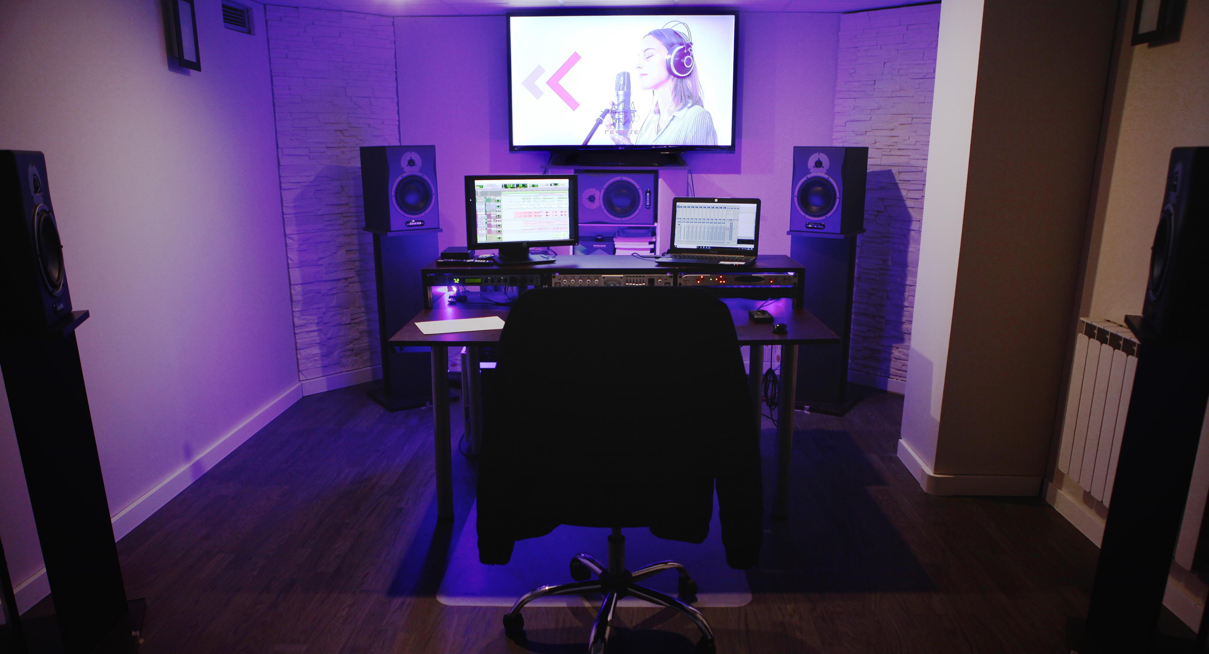 Sala de grabación y postproducción de 20m2. Sistema de monitorización 5.1 certificado por THX. Ideada para la grabación de instrumentos por línea y grabaciones de voz de pequeño formato que no requieran de cabina independiente. Dedicada a la Mezcla y Masterización de sonido para televisión y cine.